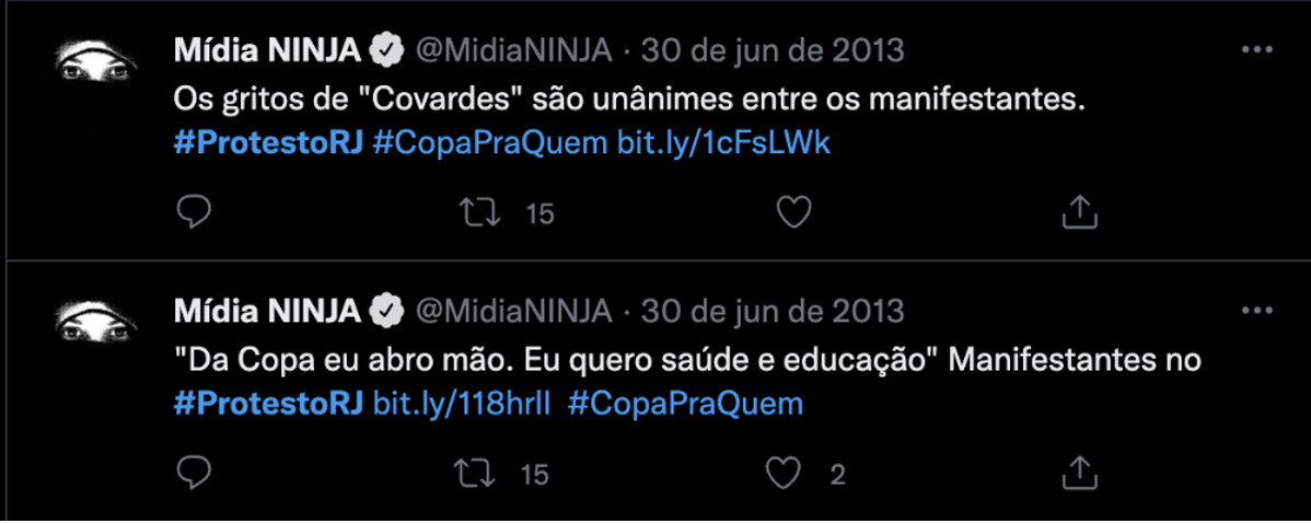 CARNEIRO, R. Artistas acusam grupo base da Mídia Ninja de estelionato, retenção de cachê e outros crimes. Revista Veja, 9 out. 2013. Disponível em: <https://veja.abril.com.br/cultura/artistas-acusam-grupo-base-da-midia-ninja-de-estelionato-retencao-de-cache-e-outros-crimes/>.